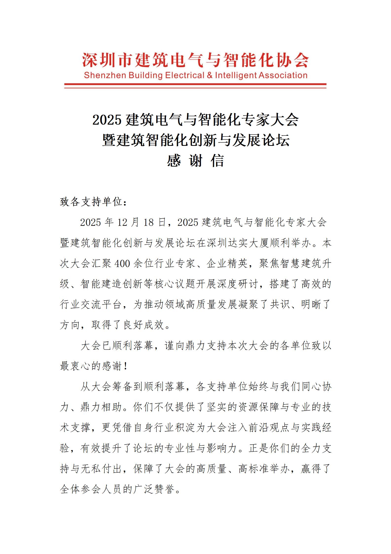 【感谢信】2025建筑电气与智能化专家大会暨建筑智能化创新与发展论坛的感谢信